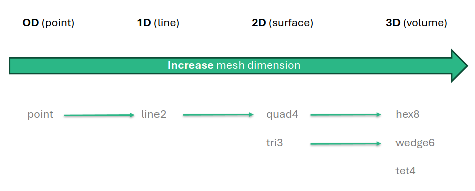 The schematic below provides an overview of available element types for each mesh dimension and how they relate when increasing the mesh dimension.